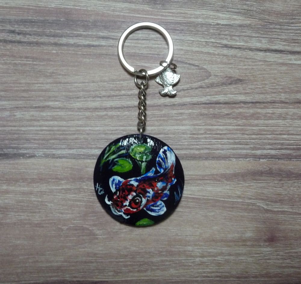 La peinture est montée à l'aide d'un anneau brisé sur un porte-clés métallique avec chaînette .