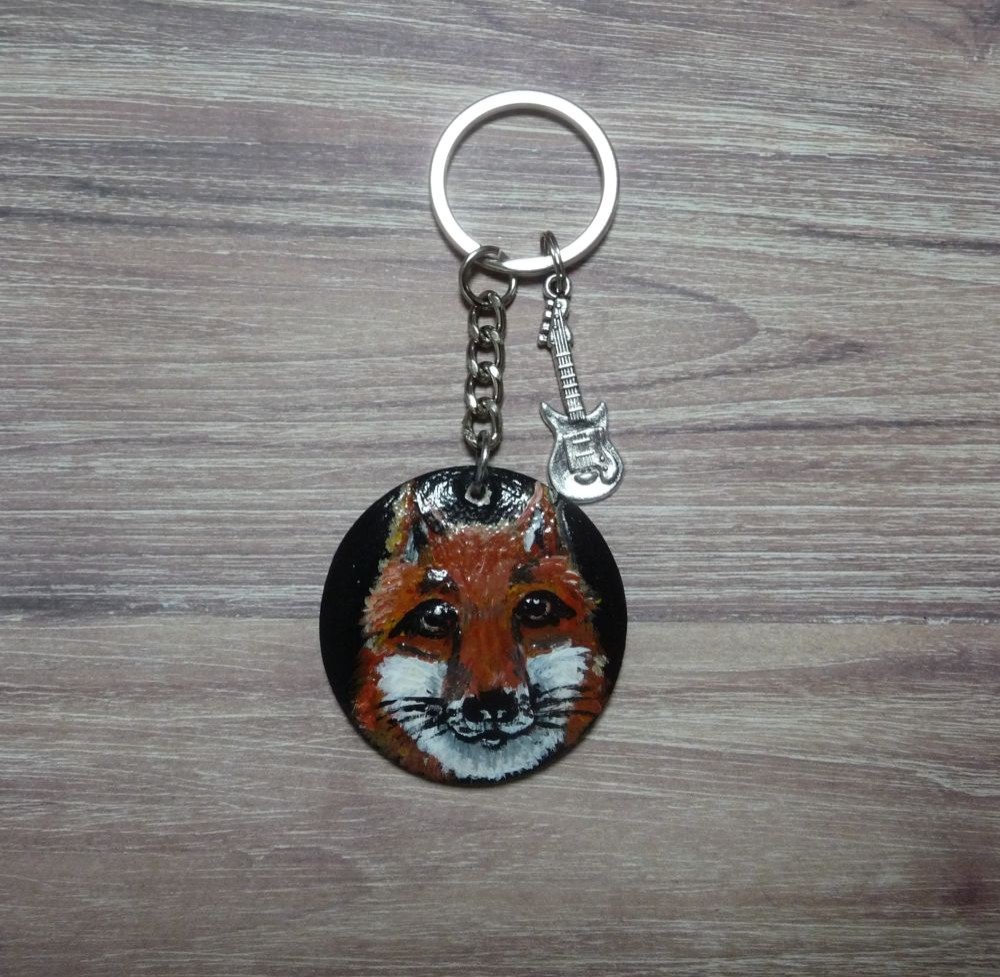 Renard peint à la main, à la peinture acrylique sur le recto d' un disque de bois de diamètre 4 cm. Le verso du disque est peint de couleur unie. Les deux faces du disque sont vernies afin de protéger la peinture.