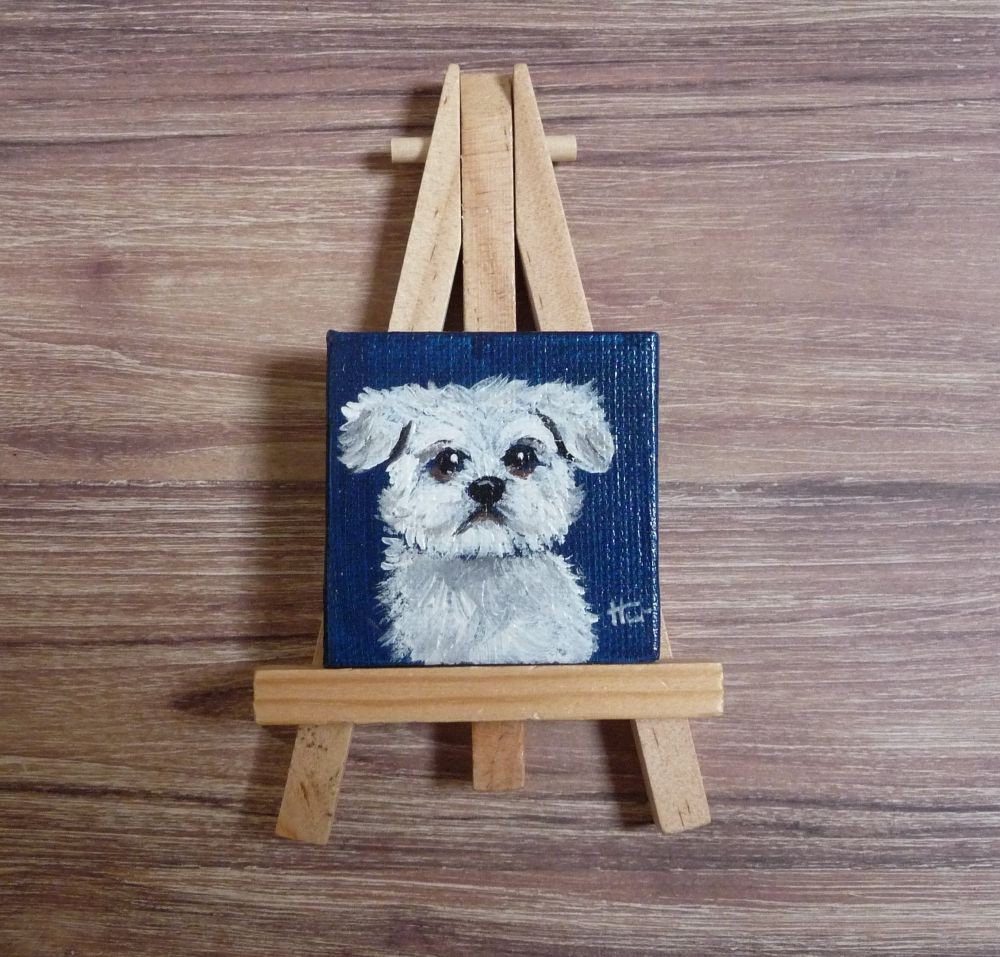Peinture réalisée à l' acrylique sur un mini châssis format : 5 cm x 5 cm (épaisseur 1 cm) vendue avec son mini chevalet en bois taille 12 cm de hauteur sur 7 cm de largeur