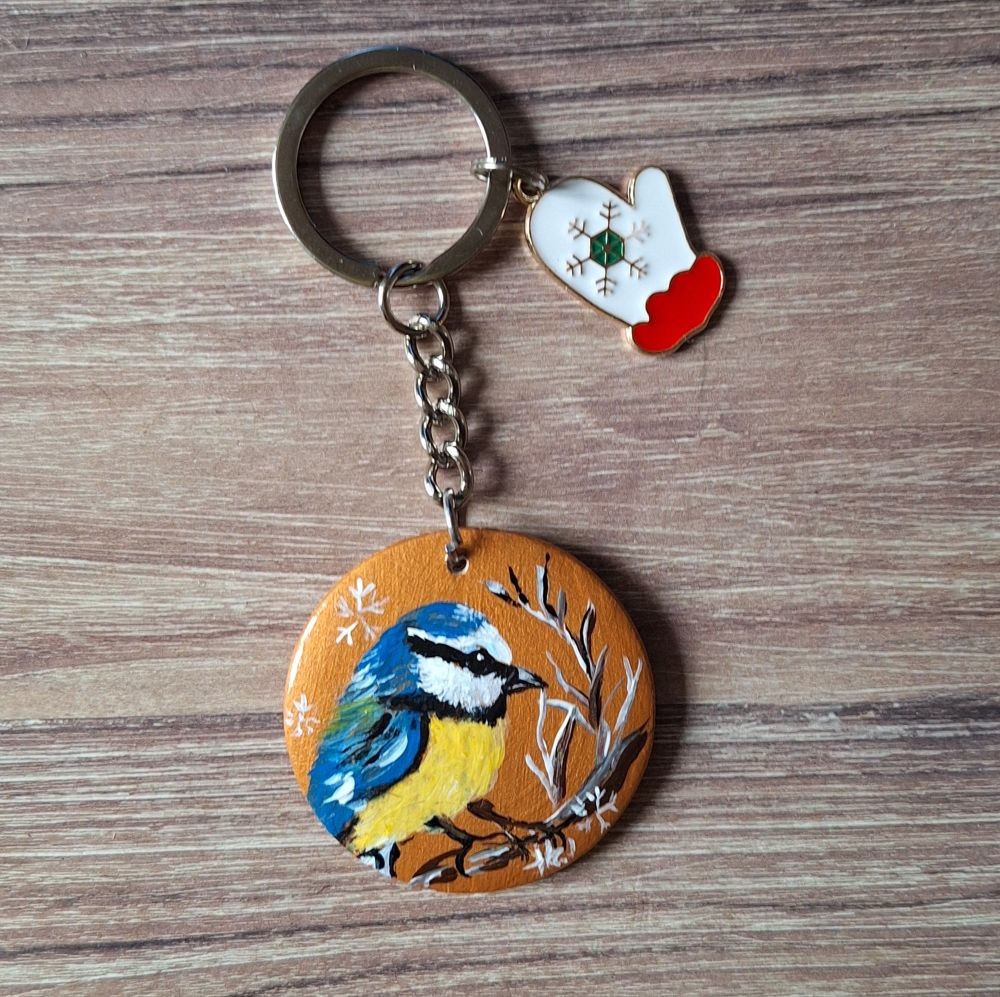 Oiseau peint à la main,  à la peinture acrylique sur le recto d' un disque de bois de diamètre 4 cm. Le verso du disque est peint de couleur unie. Les deux faces du disque sont vernies afin de protéger la peinture.