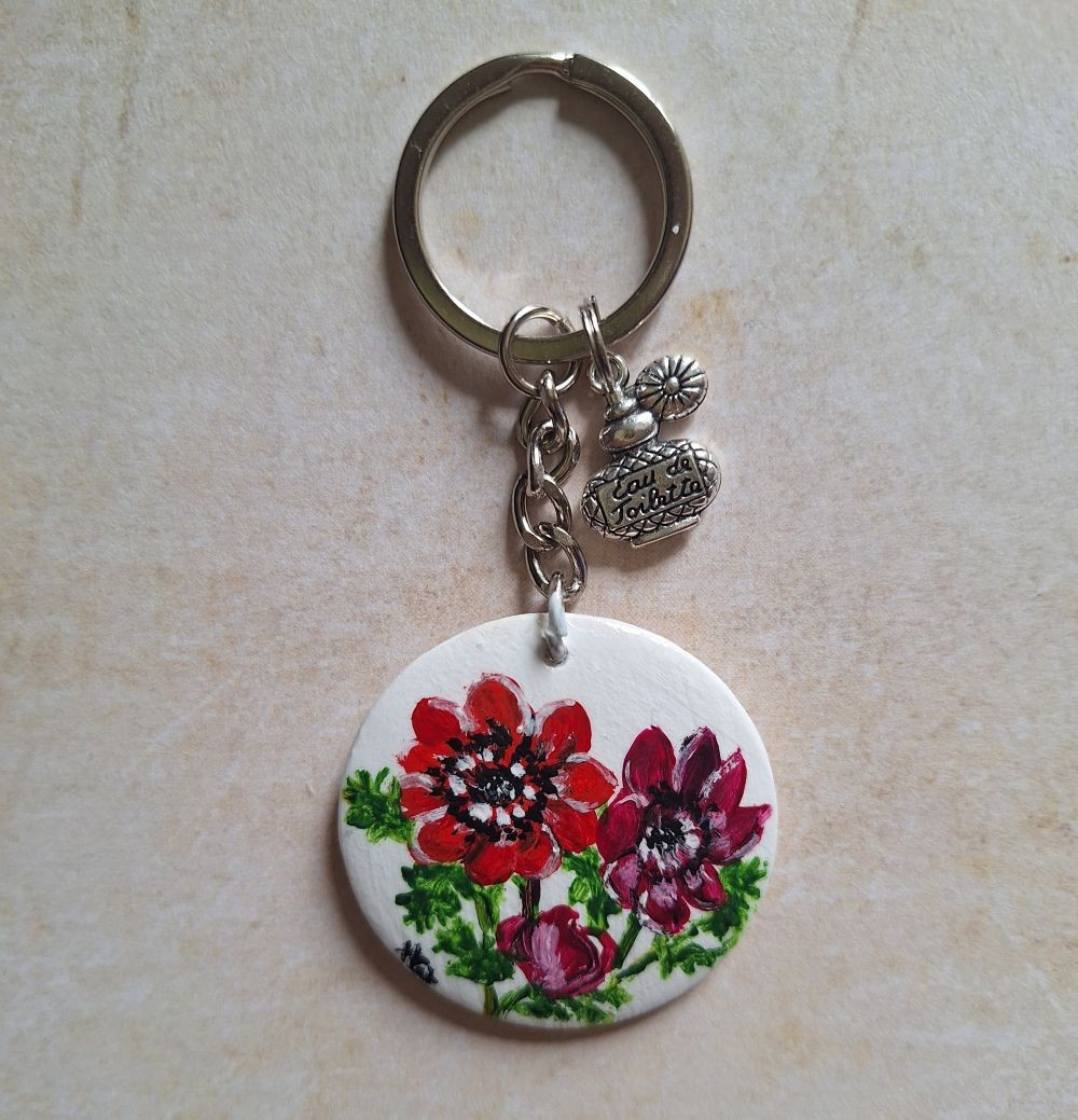 Anémones peintes à la main, à la peinture acrylique sur le recto d' un disque de bois de diamètre 4 cm. Le verso du disque est peint de couleur unie. Les deux faces du disque sont vernies afin de protéger la peinture.