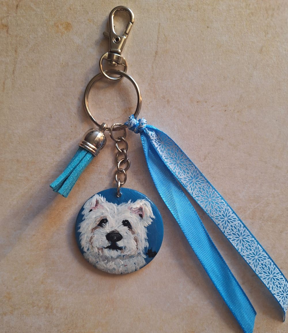 Le porte-clé est agrémenté d' un pompon et d' un ruban