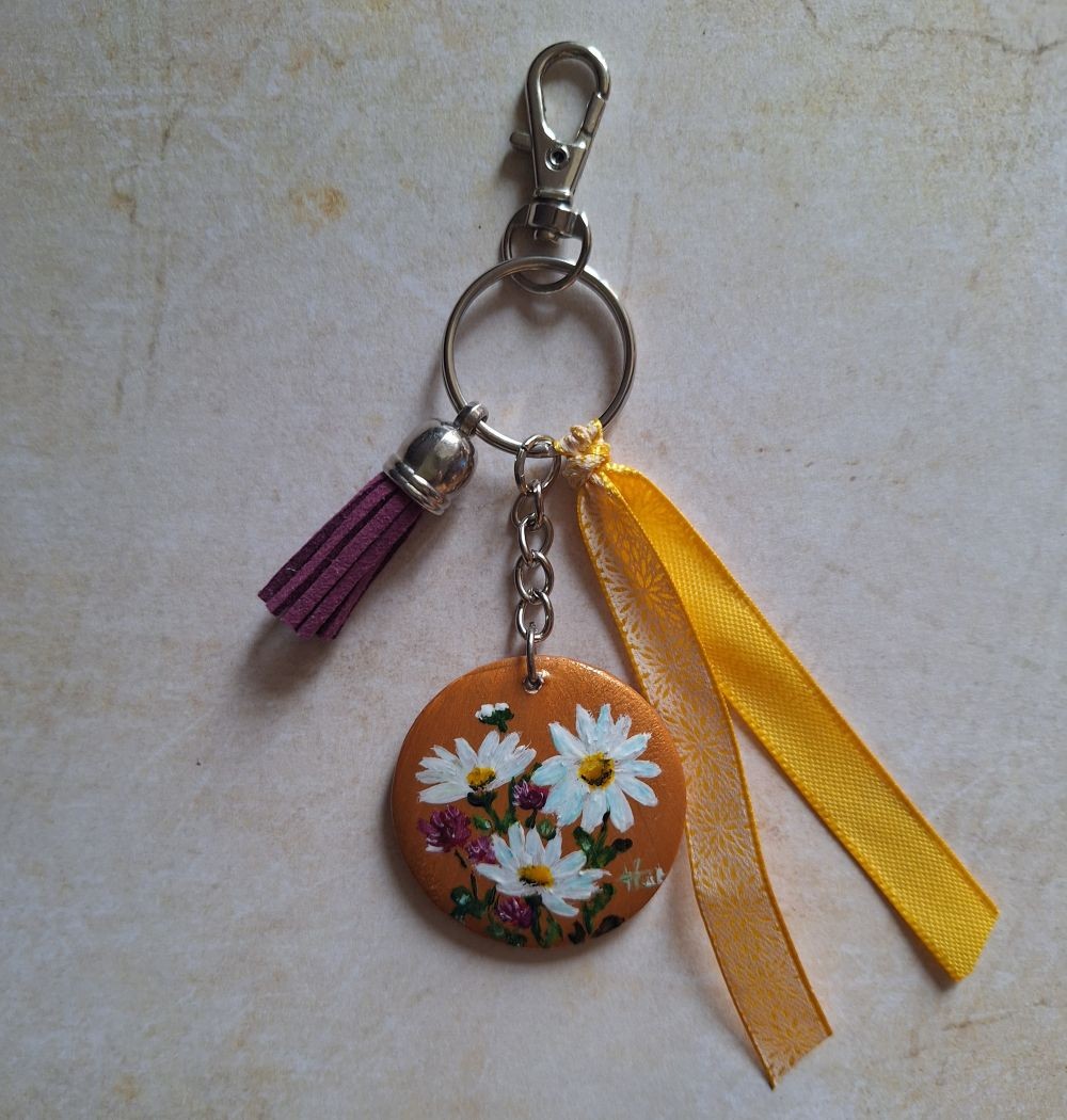 La peinture est montée à l'aide d'un anneau brisé sur un porte-clés métallique avec chaînette .